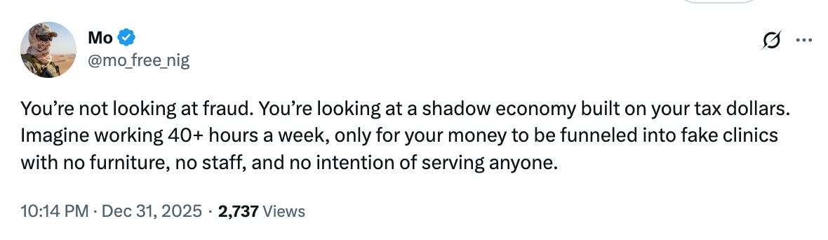 The explosive unveiling of the wildly extensive Somali-run daycare scams in Minnesota has drawn attention to a huge shadow economy, and not just in Minnesota. America, it turns out, is full of people, companies, and organizations that basically live off of fraud. We’re not talking old-fashioned waste, like $600 hammers or $1200 toilet seats. We’re talking about entities whose sole reason for existence consists of being a conduit for taxpayer money to flow directly to the people controlling them, with some of the proceeds being diverted to politicians and political organizations.