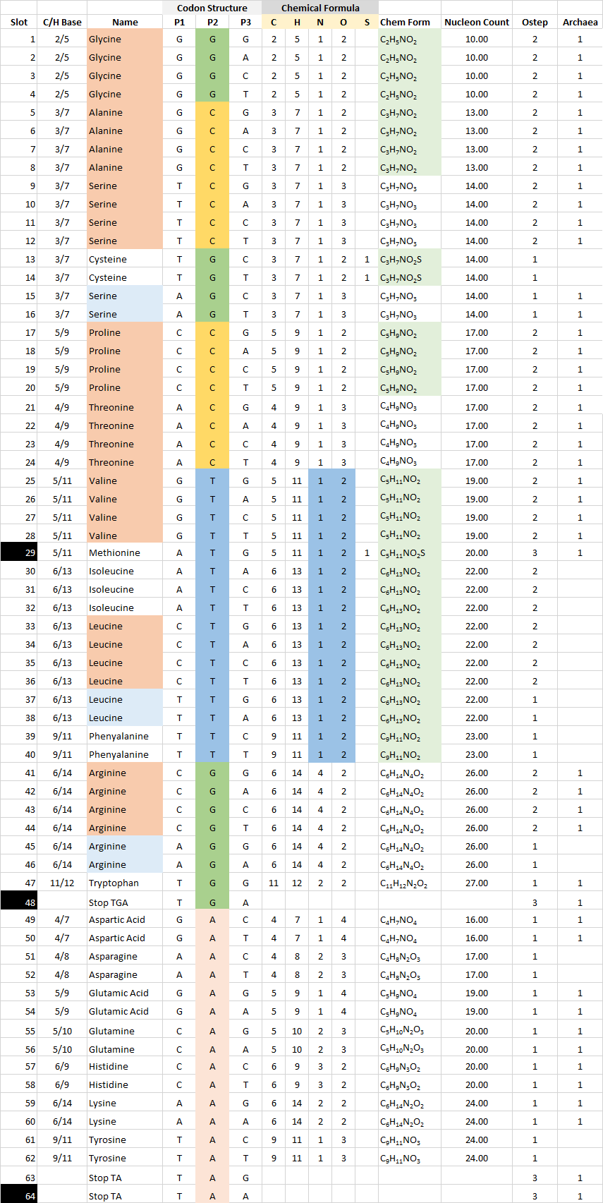 - A block (slots 49-64): Aspartic acid, Asparagine, Glutamic acid, Glutamine, Histidine, Lysine, Tyrosine, Stop TA – these are the polar/charged amino acids. Medium-high nucleon counts (16-24). All doublets.